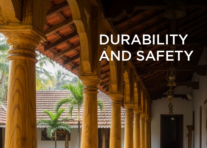 In Kerala, traditional sloped roofs and open ceilings face constant exposure to humidity and occasional leaks. Treated wood helps prevent decay and termite damage in these hidden structural elements.